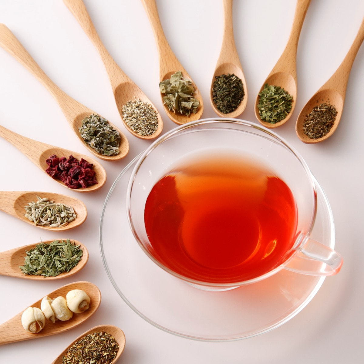 グリーンルイボス(南アフリカ)、レッドビート、マルベリー、ネトル、蓮の実、エキナセア、フェンネル、ラズベリーリーフ、レディースマントル、ステビアリーフ、甜茶