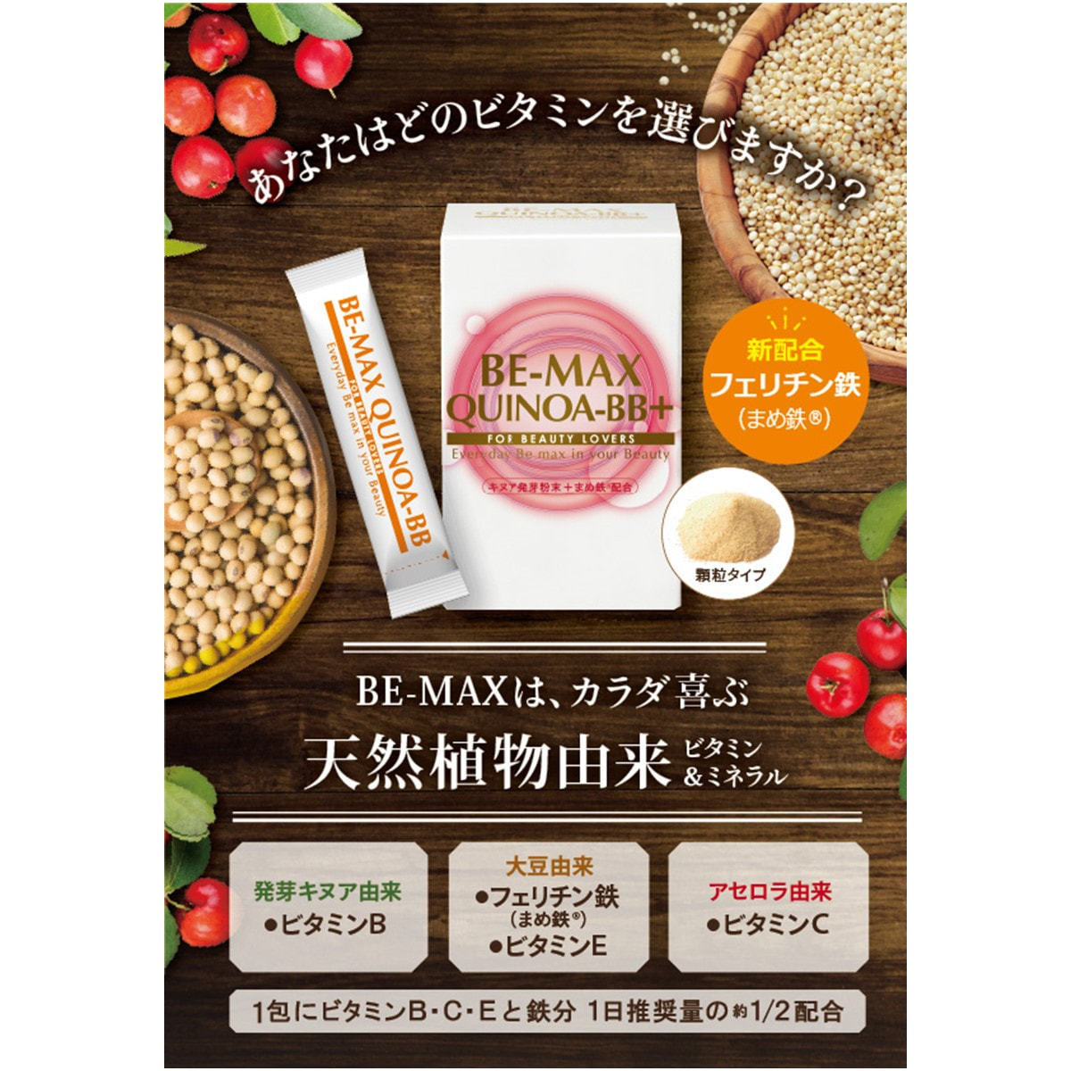 BE-MAX QUINOA-BB+には、大豆より抽出したビタミンEを配合しました。