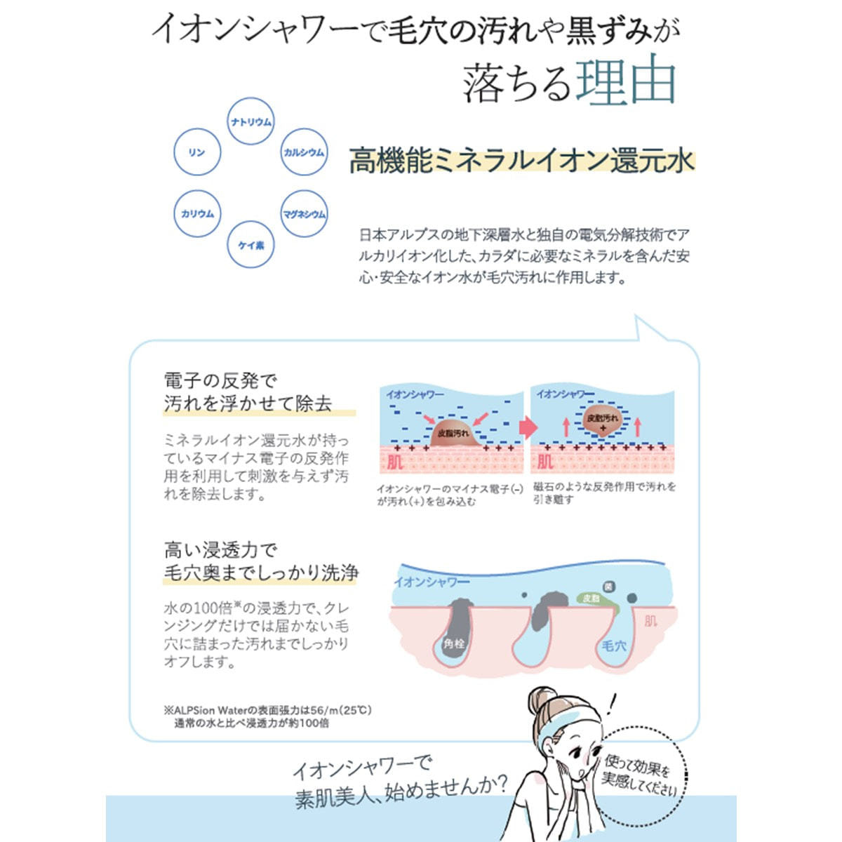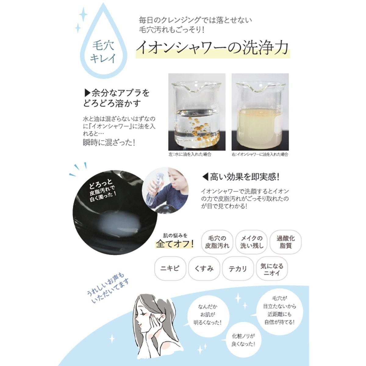イオンの力※により、ニキビ・黒ずみ毛穴などの様々な肌トラブルへの効果が期待できます。