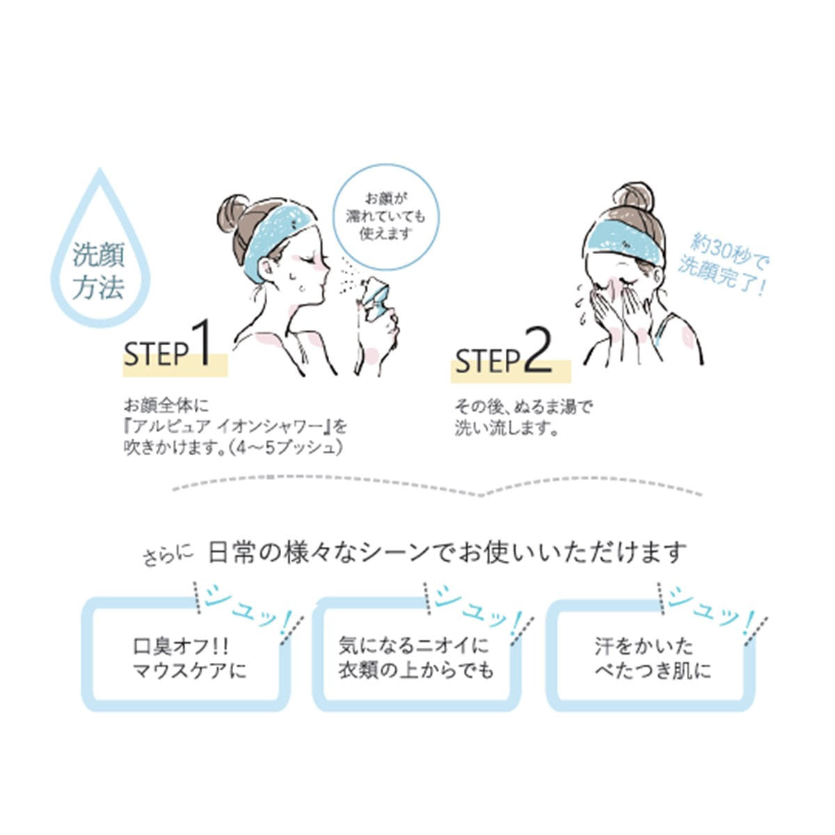 4~5プッシュお顔に吹きかけた後、ぬるま湯で洗い流します。
