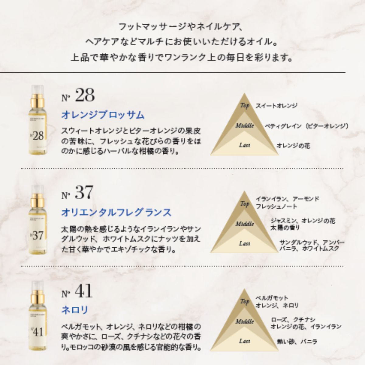 マッサージオイルとしてはもちろん、ヘアオイルとしても、お風呂やフットバスに垂らして香りづけにもご使用いただけます。